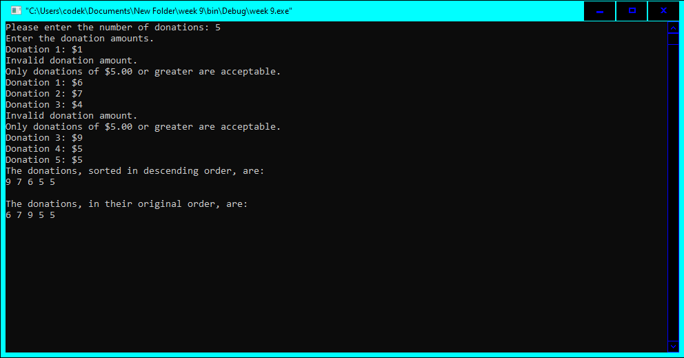 | Donations | Use user input, pointers, and arrays to sort donations + input validation | |